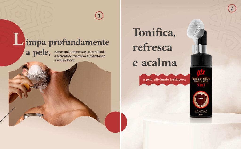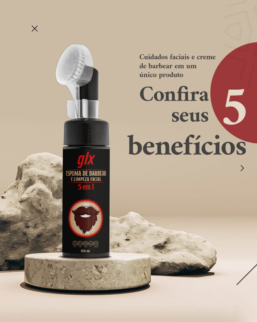 A embalagem da Espuma de Barbear 5 em 1 GLX foi pensada para entregar ergonomia, praticidade e experiência sensorial. Com um aplicador e massageador exclusivo, estimula a limpeza profunda da pele, ajudando a abrir os poros e potencializando os efeitos do produto. Além disso, a estrutura do frasco escolhido encaixa perfeitamente na mão. Tudo pensado para facilitar o uso no dia a dia, mesmo nos momentos mais corridos.